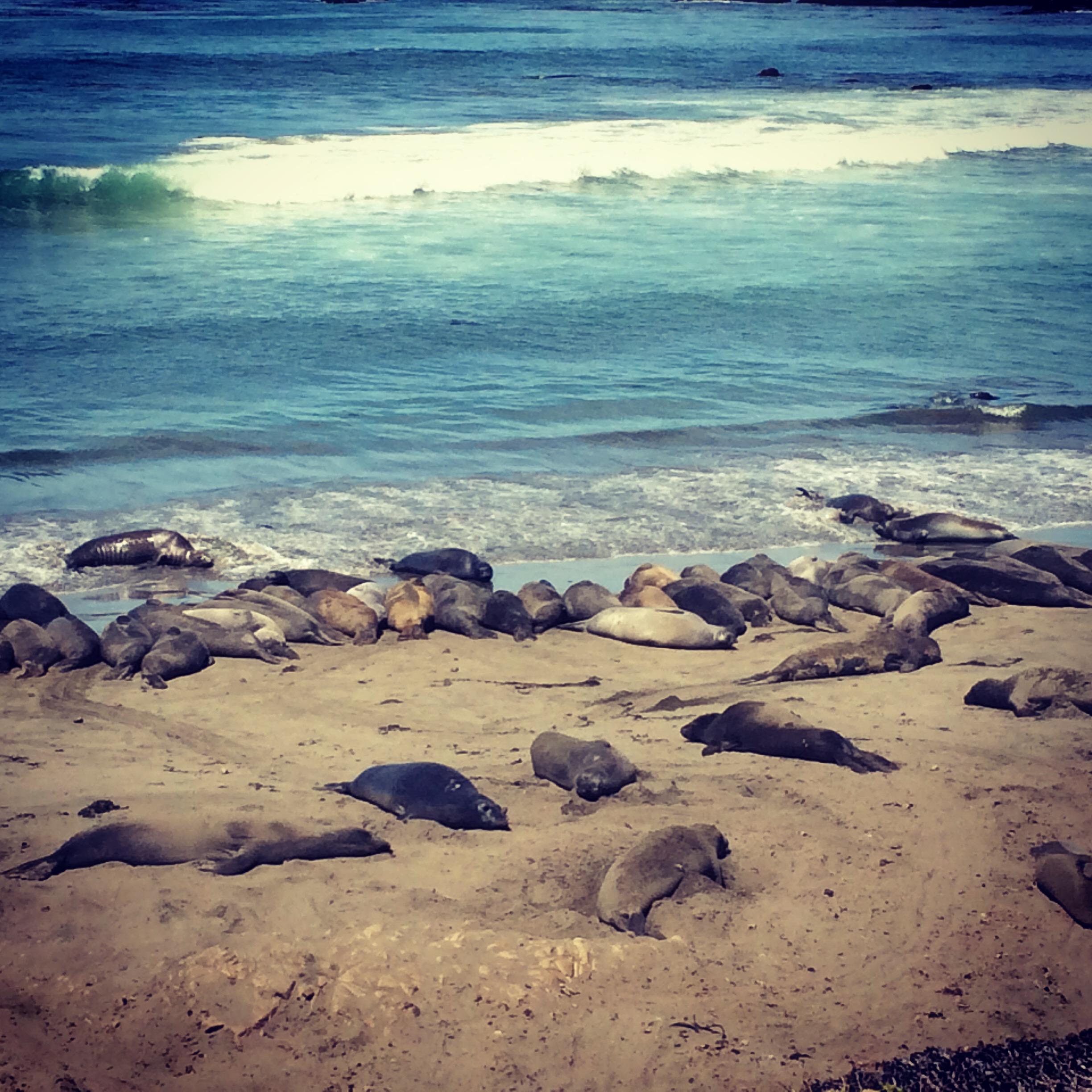 A little while later we came upon an elephant seal vista. Elephant. Seals. I had no idea they were one of my favorite animals before, but now they definitely are. Fun fact: not all these bad boys actually have the proboscis that is their namesake. None of the females do, and it takes several years for the males’ characteristic nose to fully develop. The males grow to be up to 5000 lbs. – more than twice the size of the 1800 lb. females. When the pups are birthed, they weigh a whopping 60-80 lbs., and will gain approximately 275 lbs. over the first 28 days of their lives. Here’s a picture for size comparison: